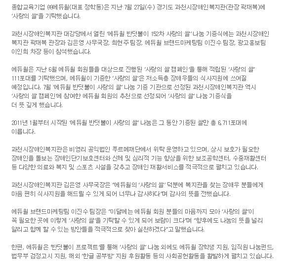 에듀윌, 과천시장애인복지관에서 ‘반딧불이 152차 사랑의 쌀’ 나눔 진행
