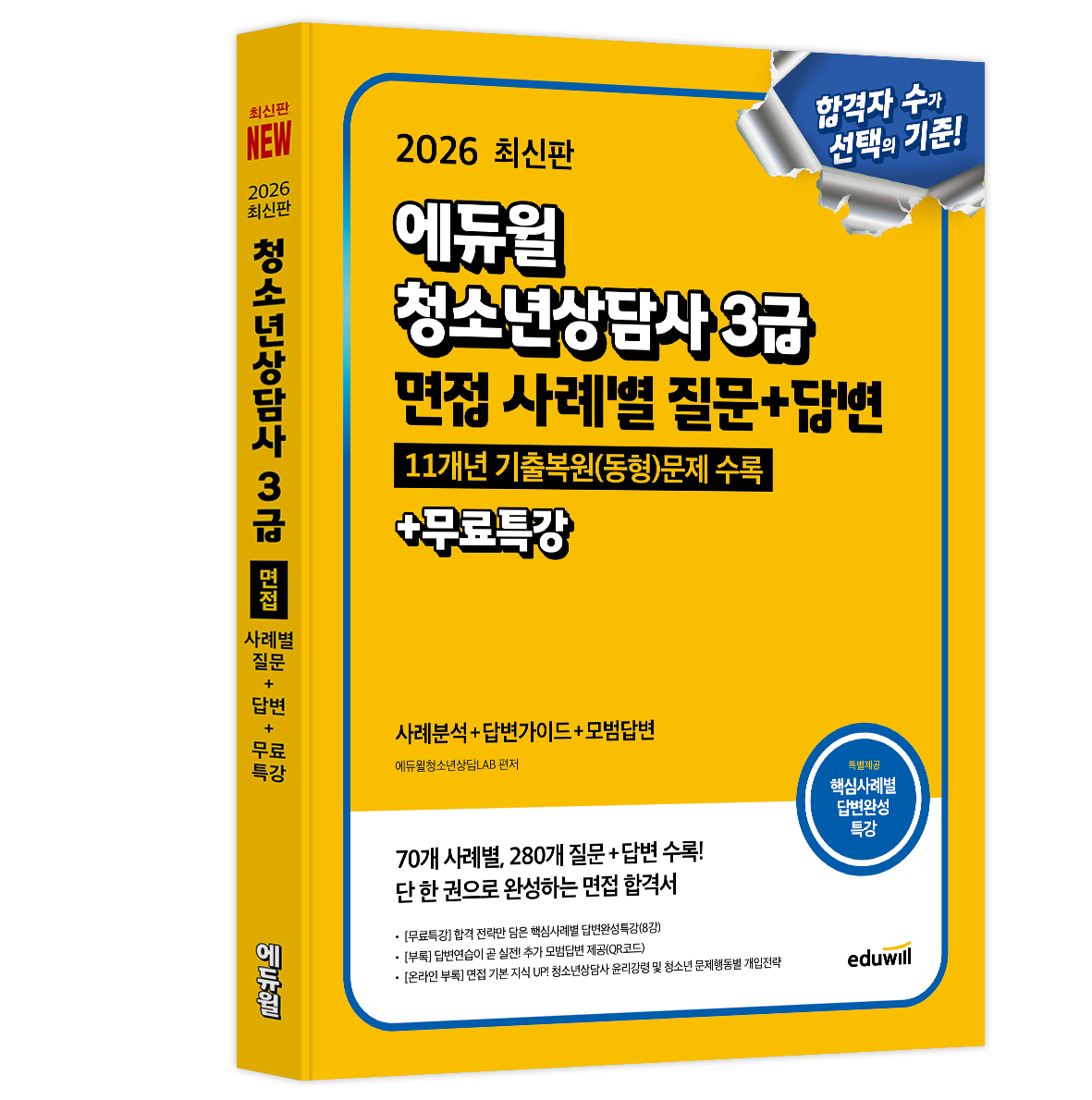 (2025-09-22) 국민교육기업 에듀윌(대표 양형남)은 ‘청소년상담사 3급’ 자격 취득을 준비하는 수험생을 위한 면접 대비서 「2026 에듀윌 청소년상담사 3급 면접 사례별 질문+답변+무료특강」 교재를 출간하며, 필기부터 면접까지 전 과정을 아우르는 수험서 라인업을 완성했다.