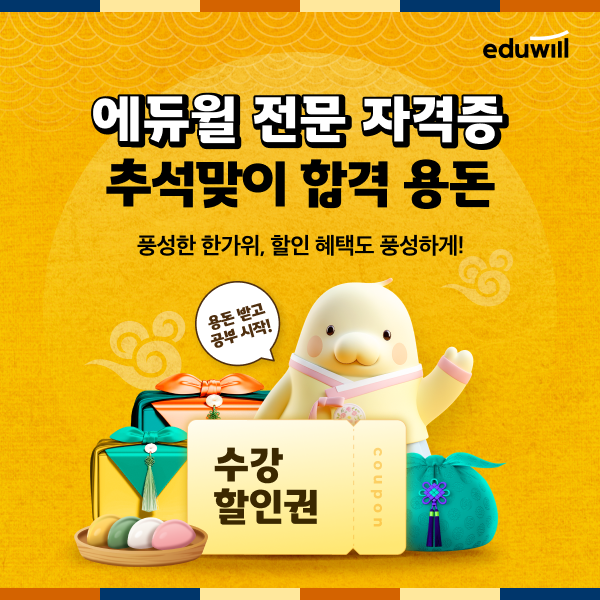(2025-10-02) 국민교육기업 에듀윌(대표 양형남)이 추석을 맞아 자격증 시험을 준비하는 수험생을 위해 ‘10월 합격용돈 프로모션’을 진행한다.