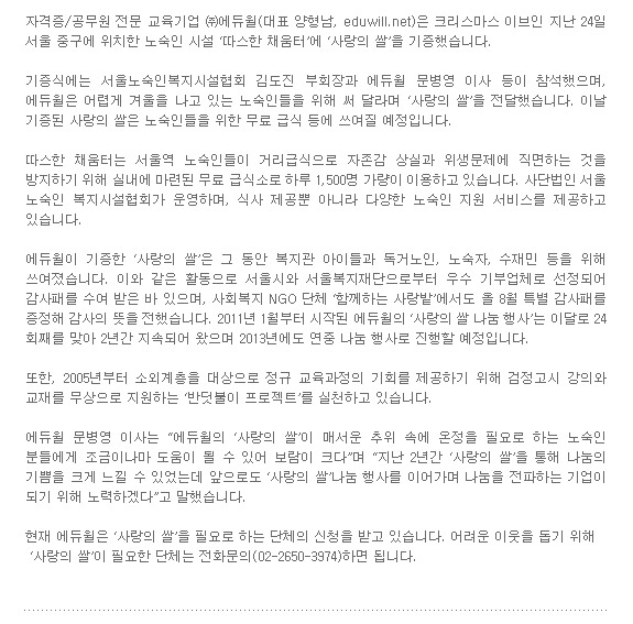 따스한 채움터에 사랑의 쌀 기증