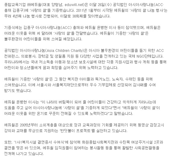 에듀윌, 아시아사랑나눔에 ‘사랑의 쌀’ 기증