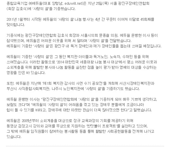 에듀윌, 광진구장애인연합회에 ‘사랑의 쌀’ 기증